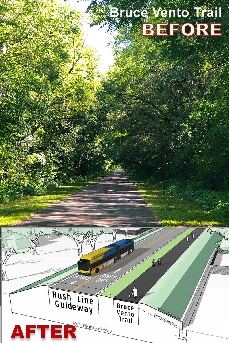 runs on top/right next to 90% of the Bruce Vento Trail, a beautiful biking/hiking trail and green wall for many residents on many streets. To accommodate the proposed Rush Line, a new 2 lane highway, called a "Guideway" would be 100 ft wide, and built over most all of this trail, making it completely unrecognizable. It's an utterly devastating decision.