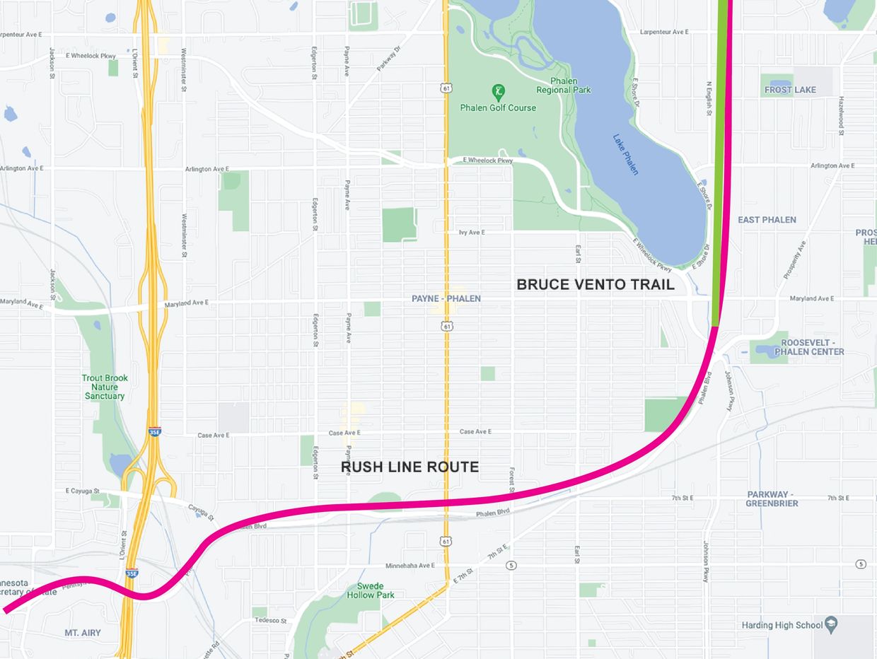 In this section, the Rush Line enters onto Phalen Boulevard running next to the Bruce Vento Trail and follows it onto Magnolia Lane, where a new dedicated bridge overpass will be built over Johnson Parkway and a new station will be constructed at this point. It then continues onto the Trail, running parallel with East Shore Drive. The proposed route