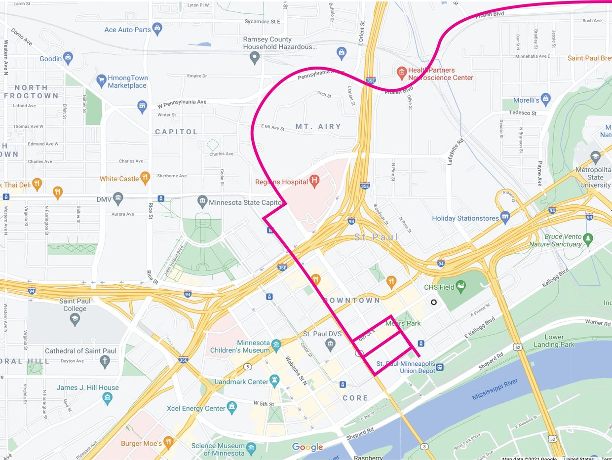 Starting from the Union Bus Depot, the outbound route turns onto Kellogg Blvd, then onto 6th Street before turning right onto North Robert Street and its own dedicated lane. It crosses over Highway 94 on an existing bridge and turns right onto 14th Street where a new station will be constructed. From 14th Street, it turns right onto Jackson Street, and the new proposed Mt. Airy Station. From here, it turns onto East Pensylvania, merging onto East Phalen Boulevard where it picks up the Bruce Vento Trail.