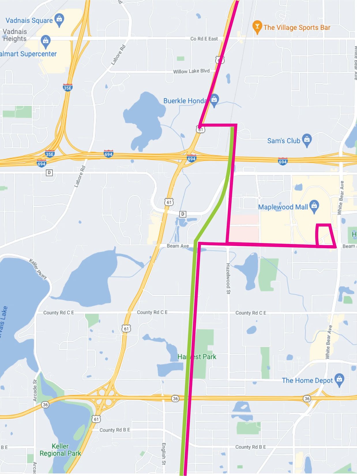 The route continues on 61 to 7th Street, where it turns left onto the proposed White Bear Station on Washington Avenue, which will be turned into a one way. After leaving the station, it turns onto 8th Avenue, where it goes right onto 8th Ave, to Highway 61,