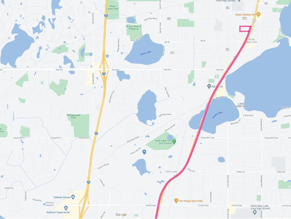 In this section, the proposed Rush Line enters Highway 61 from Buerkle Road and continues north in its own dedicated lane. With stops at both County Road E and Cedar Avenue, it then crosses over Goose Lake in its own dedicated lane to Whitaker Street Station. Here there will be a new stop light, dedicated parking spots, and a new station.